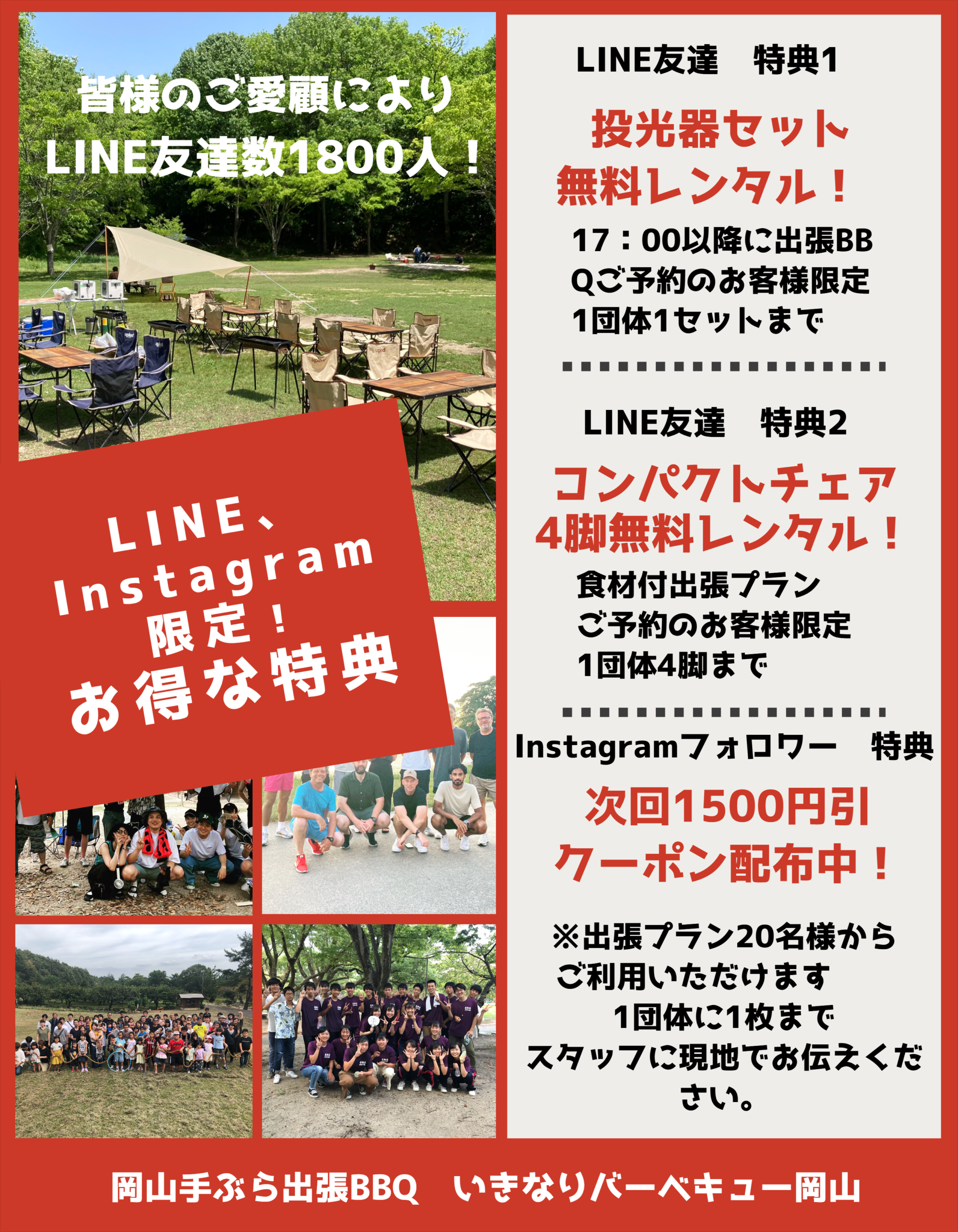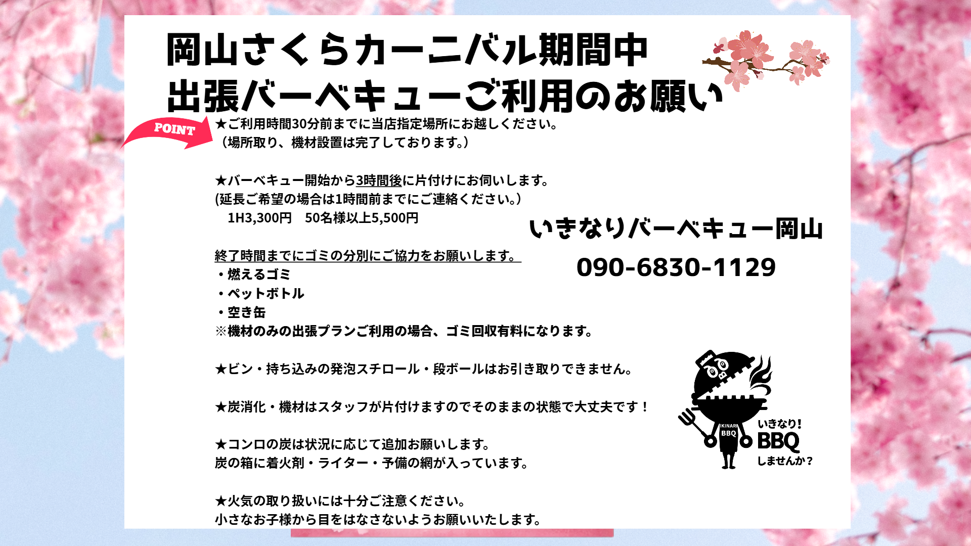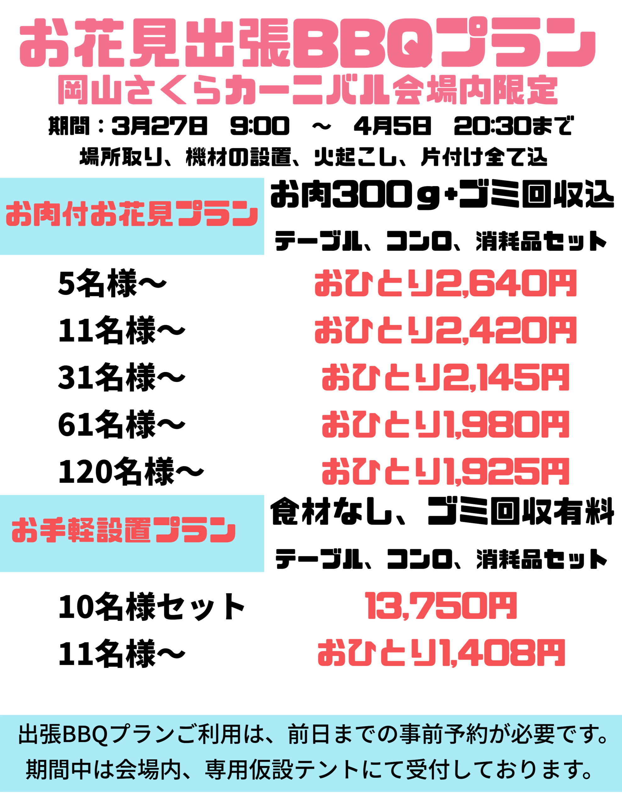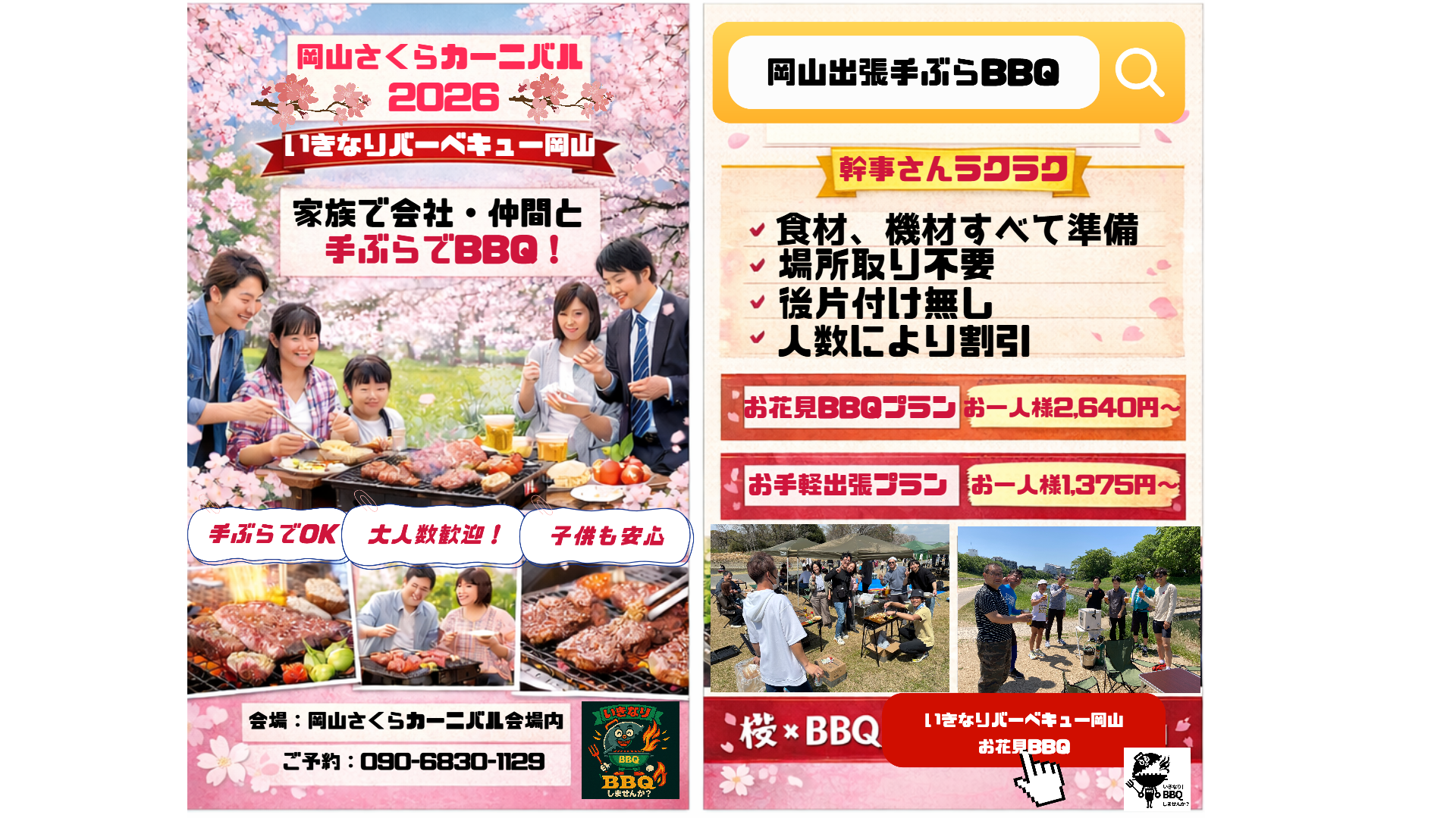 さくらカーニバル BBQご予約受付中 岡山手ぶら出張BBQ 「いきなりバーベキュー岡山」です。 お客様は希望日時と場所をお決めいただくだけ! 器材の設置準備、火おこしから片付けまで全て責任を持って行います。 不便なことは全て当店にお任せください。 ご家族、お仲間、会社でのイベントなど幅広くご利用ください。 出張対応エリア(岡山県全域) 当店より半径20km以内の地域の出張費は総額より5%となります。 その他の遠方ご依頼は、出張費5%+別途(高速代、移動費)ご依頼承ります。 ※30名様以上から高速費は無料になります。(移動費別途) お花見BBQ(さくらカーニバル) お肉300g 場所取り込 最安1,925円 お一人様 詳細 法人団体学割セット お肉300g 団体プラン 最安1,780円 お一人様 詳細 スタンダードセット お肉野菜450g お手頃なプラン 最安2,420円 お一人様 詳細 特選上肉セット お肉野菜450g 国産和牛上質プラン 最安3,410円 お一人様 詳細 女子会セット お肉野菜360g 女性お子様プラン 最安2,050円 お一人様 詳細 極撰セット お肉野菜550g 牛タン付上質プラン 最安6,160円 お一人様 詳細 出張機材設置プラン 機材の設置、片付け 1,430円~ 出張設置プラン 器材レンタル BBQ機材の貸し出し 550円~ 器材レンタル お肉の購入 BBQお肉セット 1,870円~ お肉の購入 ご予約 前日18時までにお願いいたします。人数、場所によっては、前日受け付けご対応できない場合があります。 ご予約 フォトギャラリー 砂川公園 旭川河川敷(後楽園) 倉敷美しい森 女子会BBQ せせらぎ広場 後楽園河川敷 岡山後楽園河川敷 酒津公園 会社敷地内 夜の砂川公園 砂川公園 夜の砂川公園 後楽園河川敷 日の出海岸 蓬莱橋下 渋川海水浴場 渋川海水浴場 酒津公園BBQ 酒津公園 蓬莱橋下 後楽園河川敷 旭川河川敷 後楽園河川敷 酒津公園 酒津公園 夜の酒津公園 早島ふれあいの森 ふれあいの森公園 旭川河川敷 砂川公園 砂川公園 酒津公園 酒津公園BBQ 酒津公園BBQ せせらぎ広場BBQ 渋川海水浴場 倉敷美しい森 砂川公園BBQ 倉敷市出張BBQ さくらカーニバルBBQ 旭川河川敷BBQ さくらカーニバルBBQ さくらカーニバルBBQ 酒津公園BBQ お仲間とBBQ 旭川河川敷BBQ 相生橋BBQ 蓬莱橋BBQ 酒津公園BBQ 会社イベントでBBQ さくらカーニバルBBQ 酒津公園BBQ 酒津公園BBQ グループ様でBBQ さくらカーニバルBBQ 酒津公園BBQ さくらカーニバルBBQ 酒津公園BBQ さくらカーニバルBBQ 山陽ふれあい公園BBQ さくらカーニバルBBQ せせらぎ広場BBQ せせらぎ広場BBQ 砂川公園BBQ 渋川BBQ 渋川BBQ 酒津公園 酒津公園 酒津公園 酒津公園 酒津公園 酒津公園 酒津公園 女子会 BBQ 渋川BBQ 沙美海岸BBQ さくらカーニバルBBQ 会社イベントBBQ 会社イベントBBQ サークルBBQ 砂川公園BBQ 旭川河川敷BBQ 玉島BBQ 河川敷BBQ サークルBBQ 会社イベントBBQ 学生BBQ 砂川公園BBQ 相生橋BBQ 倉敷美しい森BBQ 会社イベントBBQ 学生サークルBBQ 最新情報 岡山後楽園前(旭川河川敷)での出張BBQ 岡山で手ぶら出張バーベキューご依頼 会社敷地内にてBBQイベント 総社市水辺の楽校にて 旭川河川敷(後楽園近く)でBBQ 【百閒川せせらぎ広場】で女子会BBQ 【山陽ふれあい公園】で家族BBQ 【沙美海水浴場、沙美海岸】でBBQ 【後楽園蓬莱橋下河川敷で手ぶらBBQご依頼】 【倉敷美しい森】特選BBQプランご依頼