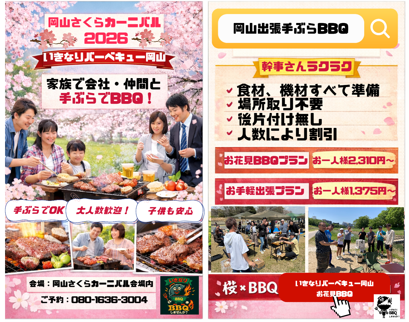 いきなりBBQ岡山 岡山手ぶら出張BBQ 「いきなりバーベキュー岡山」です。 お客様は希望日時と場所をお決めいただくだけ! 器材の設置準備、火おこしから片付けまで全て責任を持って行います。 不便なことは全て当店にお任せください。 ご家族、お仲間、会社でのイベントなど幅広くご利用ください。 出張対応エリア(岡山県全域) 当店より半径20km以内の地域の出張費は総額より5%となります。 その他の遠方ご依頼は、出張費5%+別途(高速代、移動費)ご依頼承ります。 ※30名様以上から高速費は無料になります。(移動費別途) お花見BBQセット(さくらカーニバル) お肉300g 最安1,903円 お一人様 詳細 法人団体学割セット お肉300g 団体プラン 最安1,780円 お一人様 詳細 スタンダードセット お肉野菜450g お手頃なプラン 最安2,420円 お一人様 詳細 特選上肉セット お肉野菜450g 国産和牛上質プラン 最安3,410円 お一人様 詳細 女子会セット お肉野菜360g 女性お子様プラン 最安2,050円 お一人様 詳細 極撰セット お肉野菜550g 牛タン付上質プラン 最安6,160円 お一人様 詳細 出張機材設置プラン 機材の設置、片付け 1,430円~ 出張設置プラン 器材レンタル BBQ機材の貸し出し 550円~ 器材レンタル お肉の購入 BBQお肉セット 1,870円~ お肉の購入 ご予約 前日18時までにお願いいたします。人数、場所によっては、前日受け付けご対応できない場合があります。 ご予約 フォトギャラリー 砂川公園 旭川河川敷(後楽園) 倉敷美しい森 女子会BBQ せせらぎ広場 後楽園河川敷 岡山後楽園河川敷 酒津公園 会社敷地内 夜の砂川公園 砂川公園 夜の砂川公園 後楽園河川敷 日の出海岸 蓬莱橋下 渋川海水浴場 渋川海水浴場 酒津公園BBQ 酒津公園 蓬莱橋下 後楽園河川敷 旭川河川敷 後楽園河川敷 酒津公園 酒津公園 夜の酒津公園 早島ふれあいの森 ふれあいの森公園 旭川河川敷 砂川公園 砂川公園 酒津公園 酒津公園BBQ 酒津公園BBQ せせらぎ広場BBQ 渋川海水浴場 倉敷美しい森 砂川公園BBQ 倉敷市出張BBQ さくらカーニバルBBQ 旭川河川敷BBQ さくらカーニバルBBQ さくらカーニバルBBQ 酒津公園BBQ お仲間とBBQ 旭川河川敷BBQ 相生橋BBQ 蓬莱橋BBQ 酒津公園BBQ 会社イベントでBBQ さくらカーニバルBBQ 酒津公園BBQ 酒津公園BBQ グループ様でBBQ さくらカーニバルBBQ 酒津公園BBQ さくらカーニバルBBQ 酒津公園BBQ さくらカーニバルBBQ 山陽ふれあい公園BBQ さくらカーニバルBBQ せせらぎ広場BBQ せせらぎ広場BBQ 砂川公園BBQ 渋川BBQ 渋川BBQ 酒津公園 酒津公園 酒津公園 酒津公園 酒津公園 酒津公園 酒津公園 女子会 BBQ 渋川BBQ 沙美海岸BBQ さくらカーニバルBBQ 会社イベントBBQ 会社イベントBBQ サークルBBQ 砂川公園BBQ 旭川河川敷BBQ 玉島BBQ 河川敷BBQ サークルBBQ 会社イベントBBQ 学生BBQ 砂川公園BBQ 相生橋BBQ 倉敷美しい森BBQ 会社イベントBBQ 学生サークルBBQ 最新情報 岡山後楽園前(旭川河川敷)での出張BBQ 岡山で手ぶら出張バーベキューご依頼 会社敷地内にてBBQイベント 総社市水辺の楽校にて 旭川河川敷(後楽園近く)でBBQ 【百閒川せせらぎ広場】で女子会BBQ 【山陽ふれあい公園】で家族BBQ 【沙美海水浴場、沙美海岸】でBBQ 【後楽園蓬莱橋下河川敷で手ぶらBBQご依頼】 【倉敷美しい森】特選BBQプランご依頼