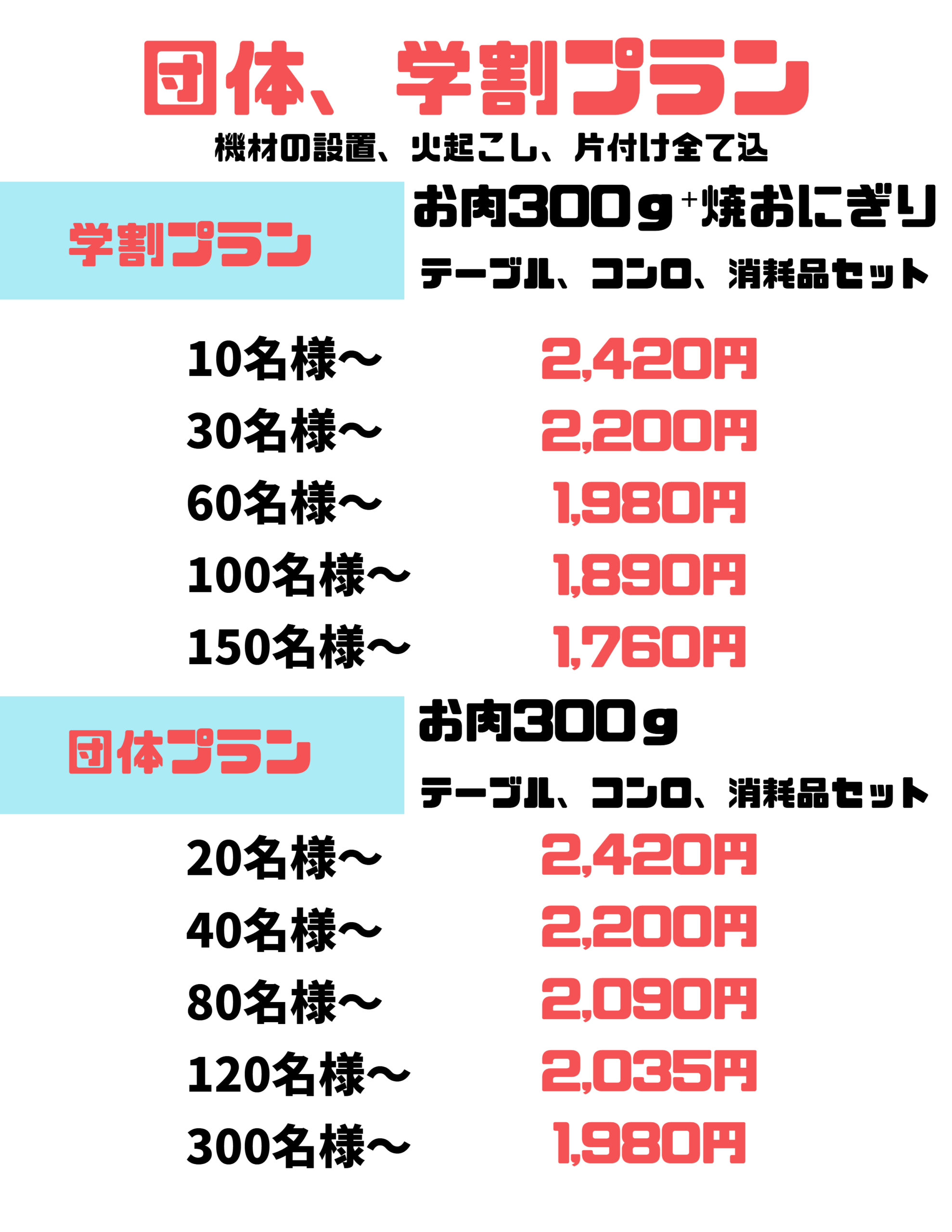 現地での機材設置、火おこし、片付けまで全て含まれます。